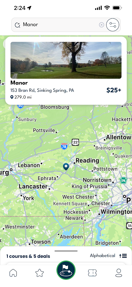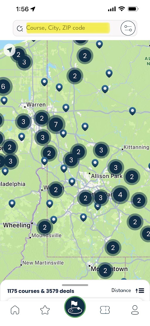 On the "Explore" tab you can search for all the courses and deals in your TeeTime Golf Pass.