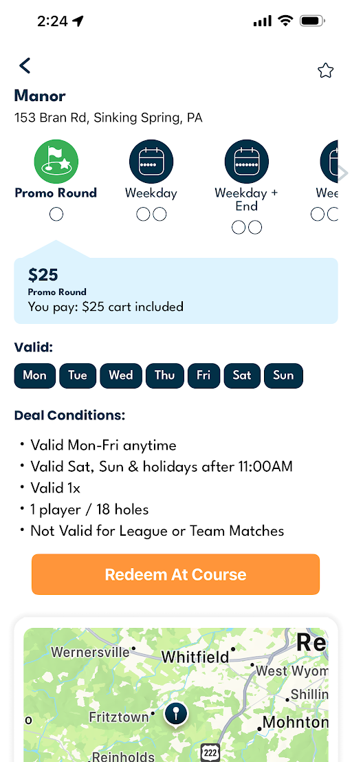 To redeem a deal, search for the course and click on the course picture which will take you to the Deal Details screen. When you get to the golf course and check in at the pro shop, show the golf course attendant your phone and they will click on the ...