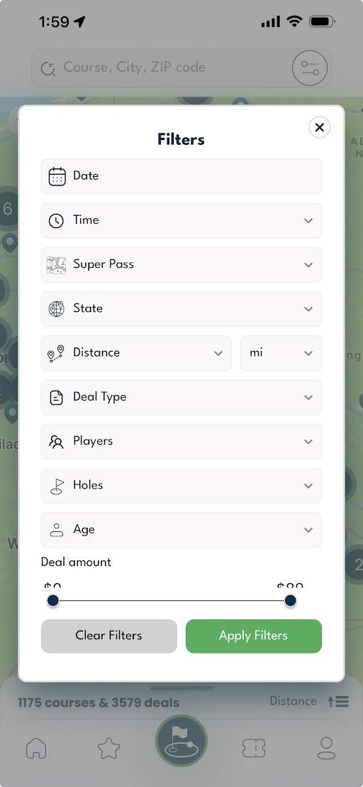 You can filter your search by: State, Players, Holes, Age and Distance from you. To access all the filters, just swipe left in the filter section.